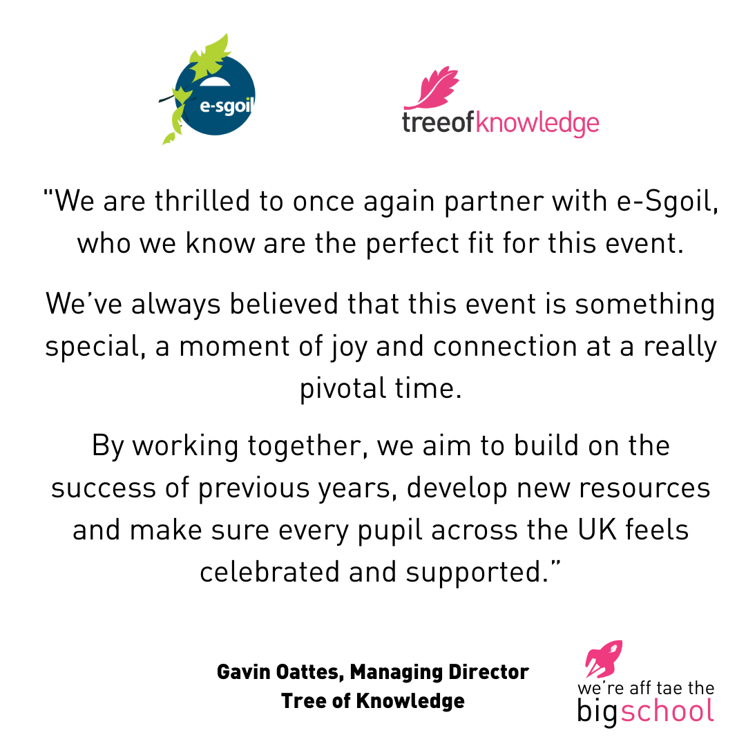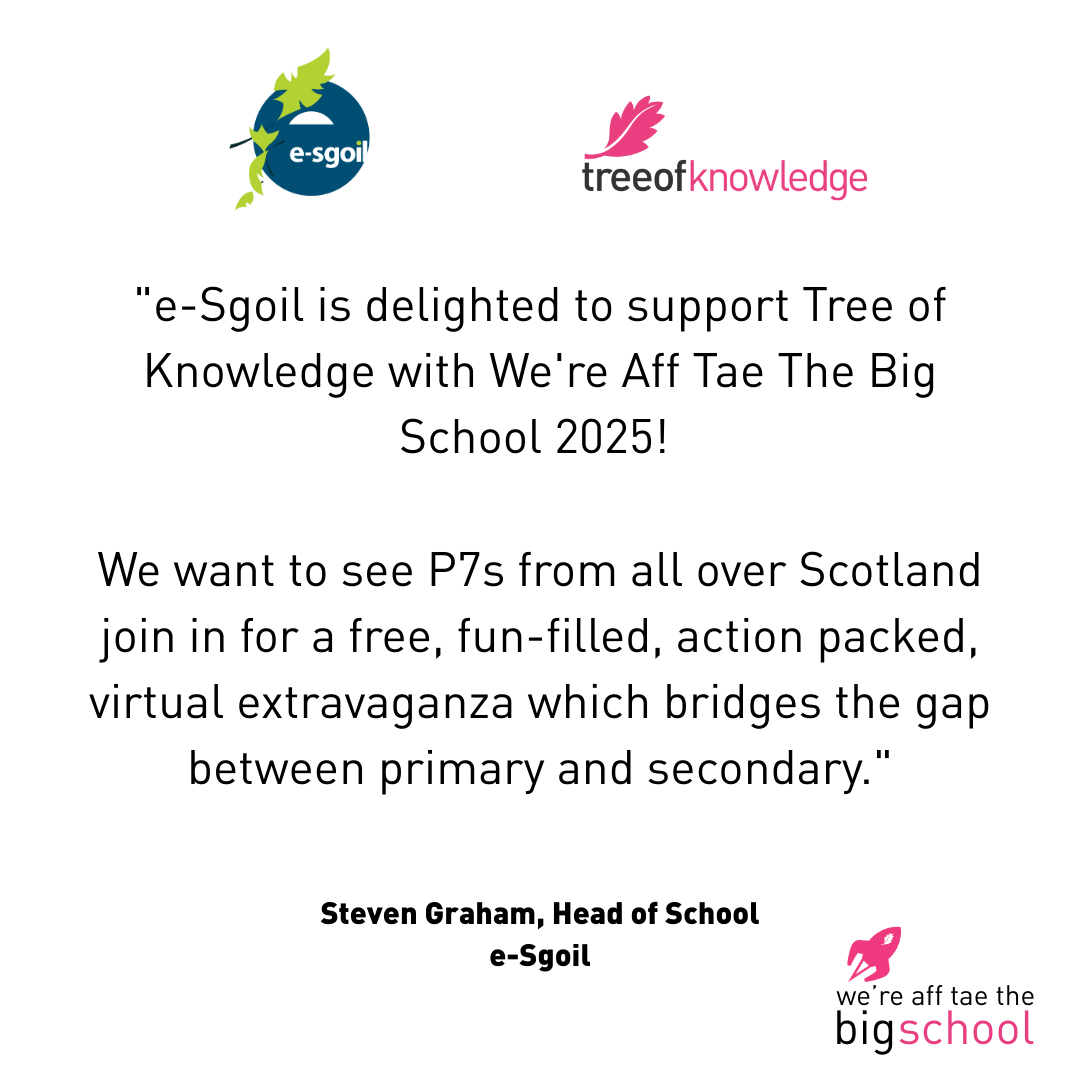 Tree of Knowledge, in partnership with e-Sgoil, is delighted to bring back We’re Aff Tae The Big School — the UK’s biggest and bonkers-est P7/Y6 online transition celebration!