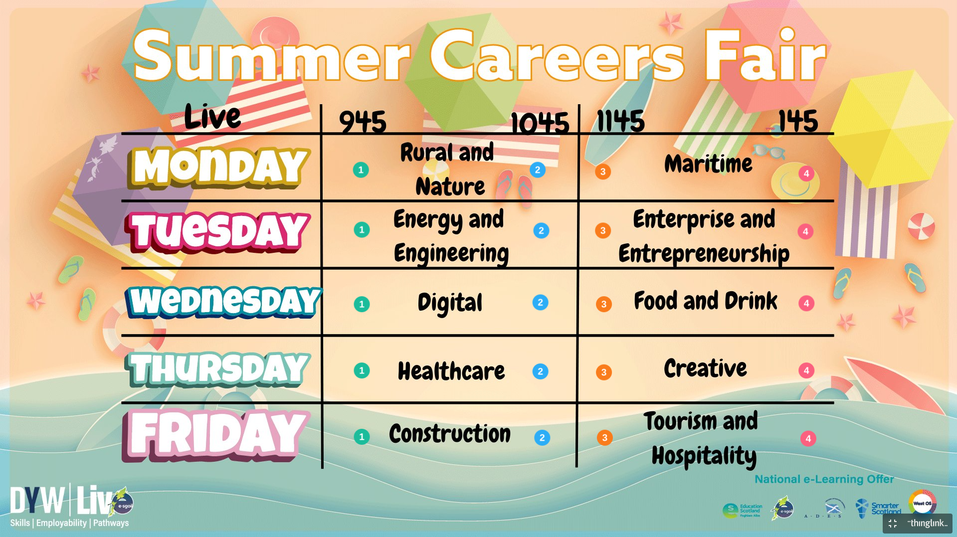 Summer Careers Fair takes place from Monday 19th June to Friday 23rd June 2023. The week will feature 10 industry sectors, one each morning (9:45 and 10:45 sessions) and afternoon (11:45 and 13:45 sessions).
