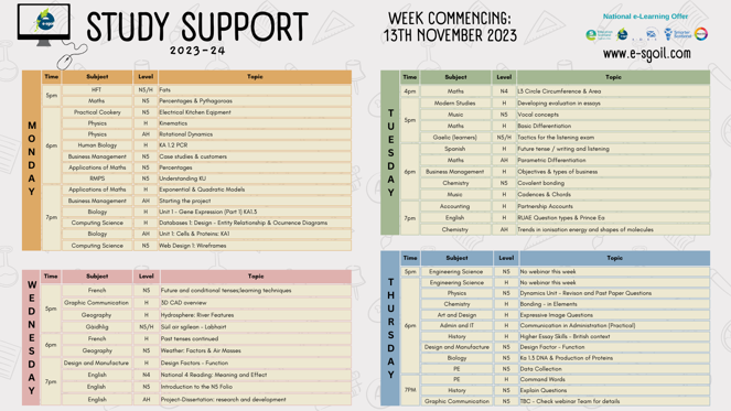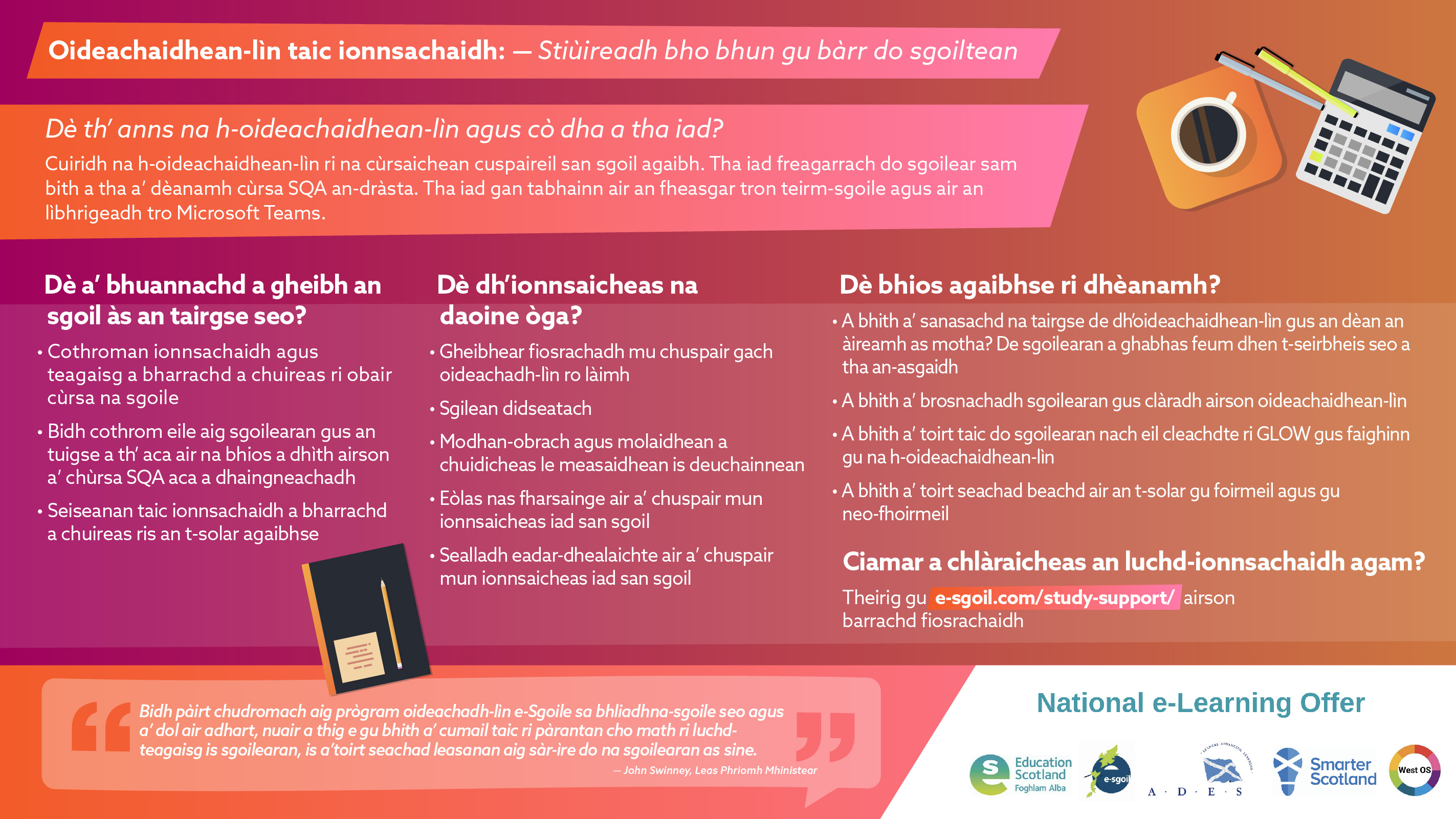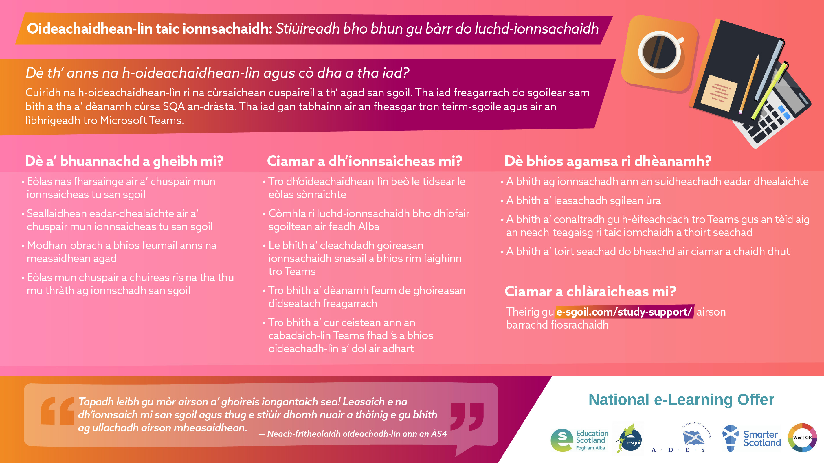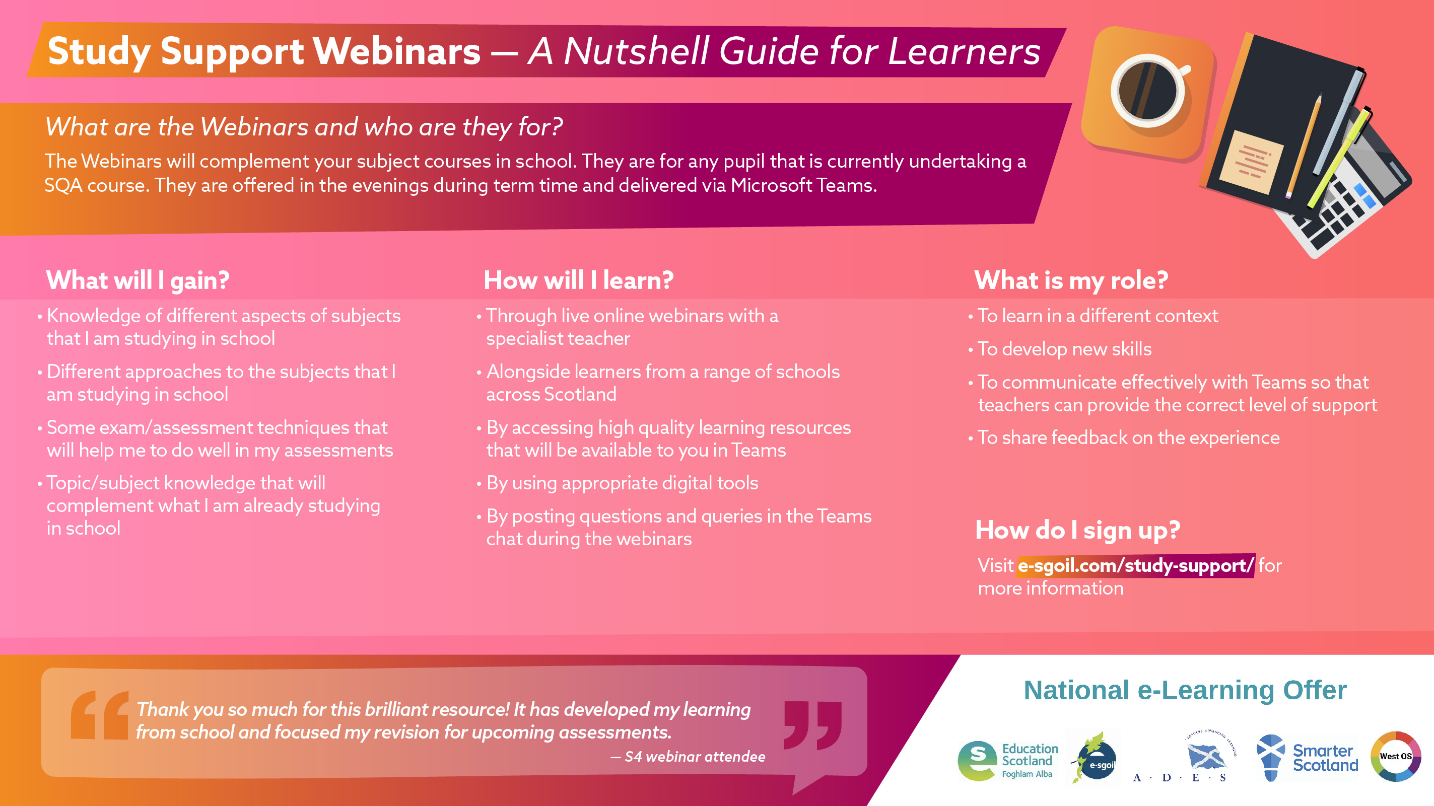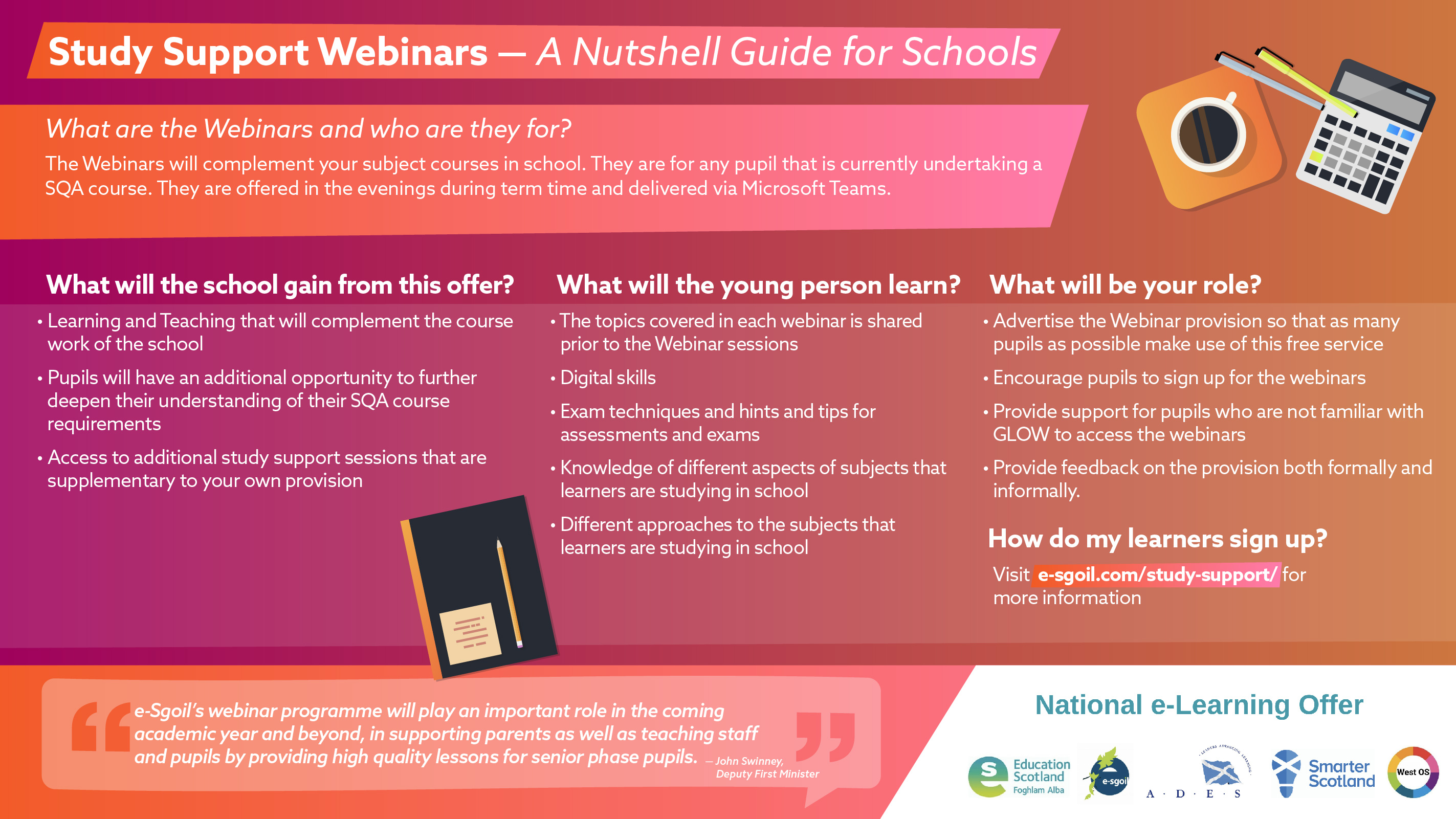 Welcome to the e-Sgoil Study Support programme page. Registration for this year's evening webinars is now live.