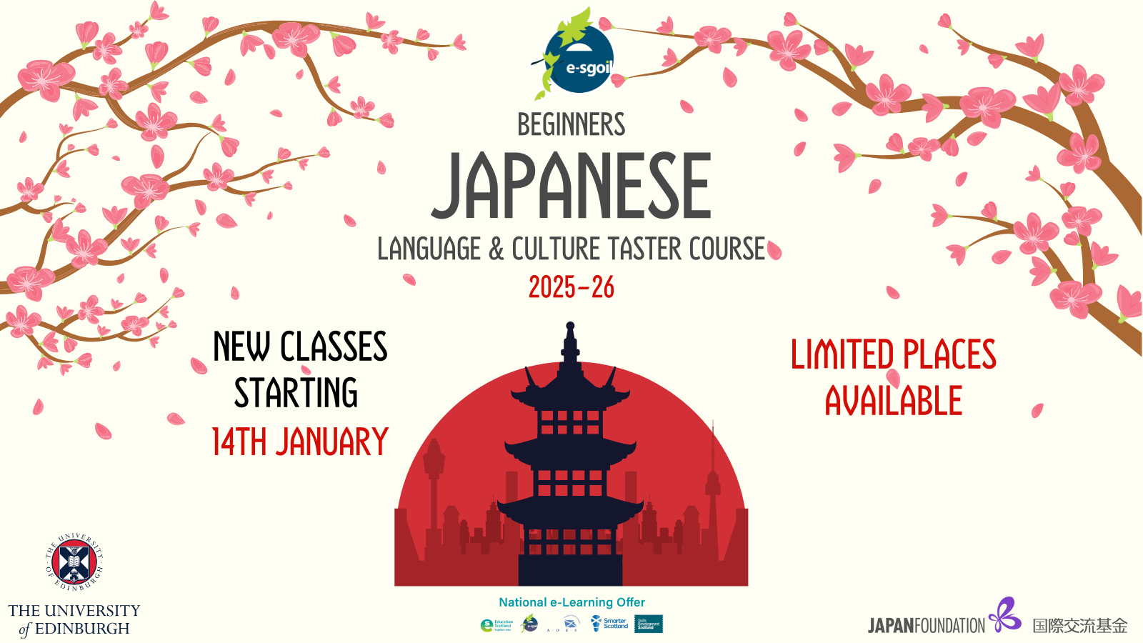 Once again in partnership with Edinburgh University and the Japanese Foundation we are offering beginner courses for Japanese Language and Culture.